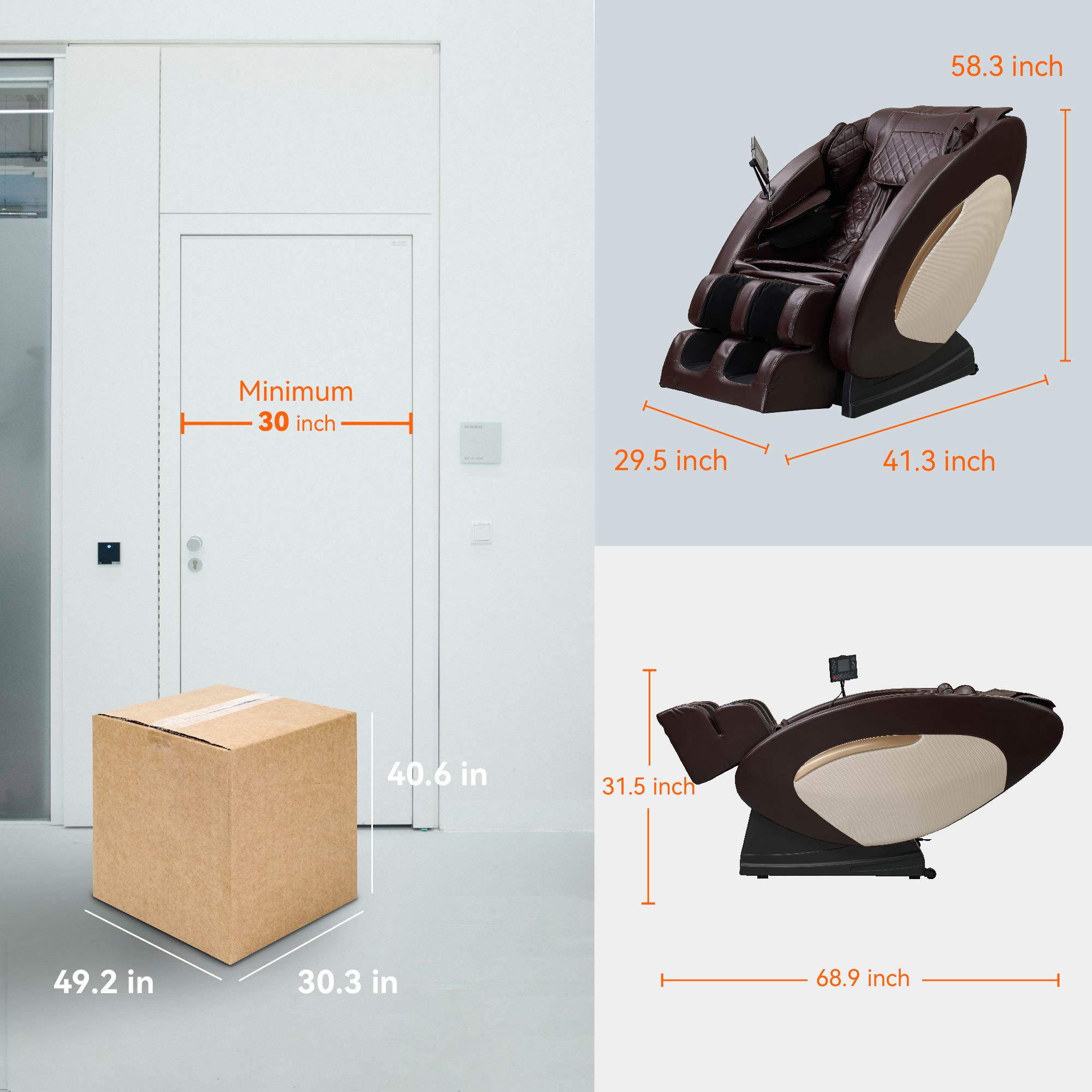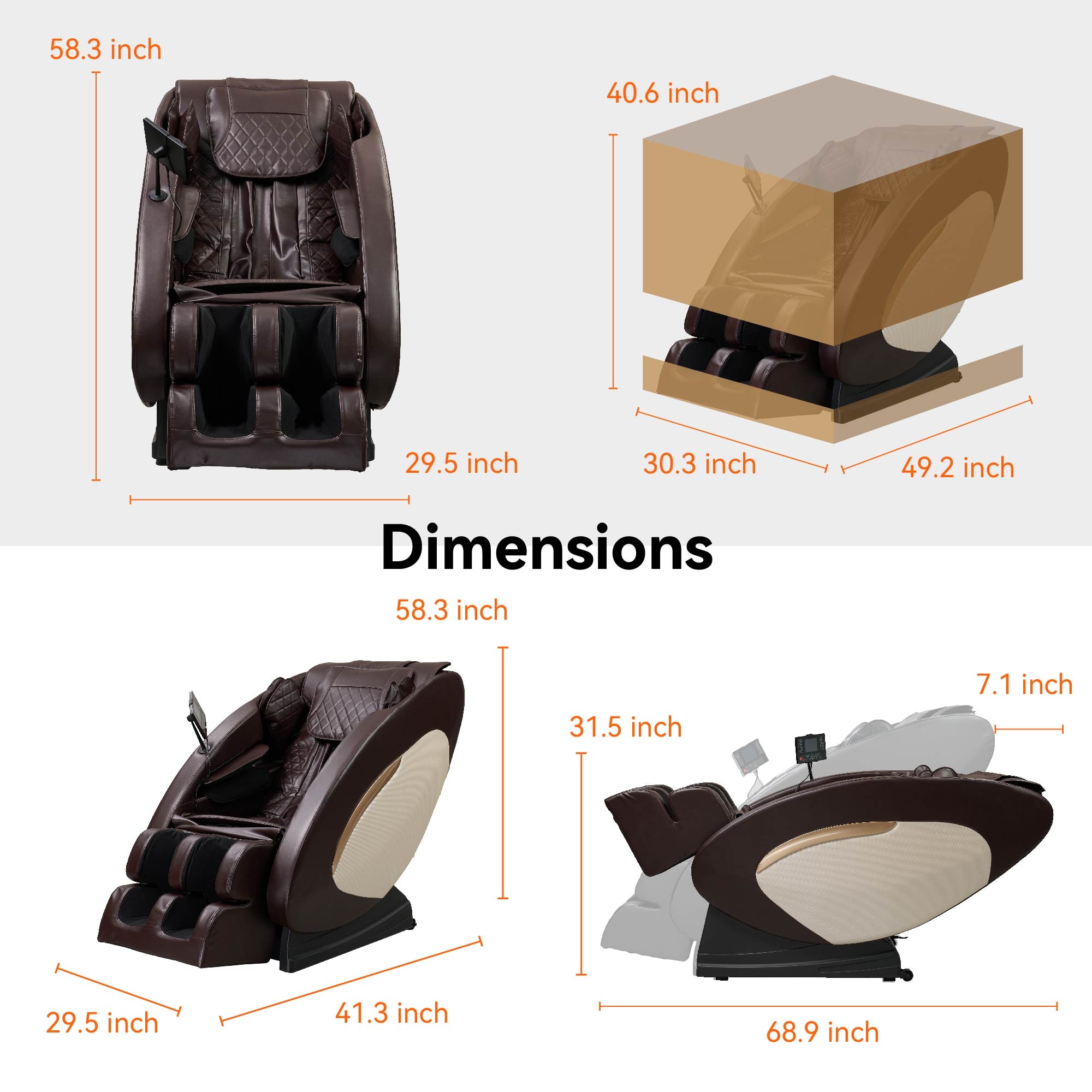 Designed for both home and office settings, this massage chair caters to a variety of needs, whether it’s relieving muscle tension, reducing fatigue, or alleviating stress. Its sleek, modern design seamlessly blends into any décor style, while its space-saving dimensions (upright: 58.3" x 29.5" x 41.3", reclined: 68.9" x 29.5" x 31.5", wall clearance: 7.1") make it suitable for a wide range of room layouts. Relax, recharge, and rediscover your well-being every day.